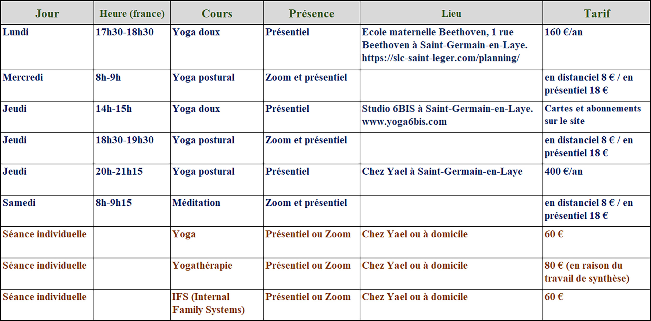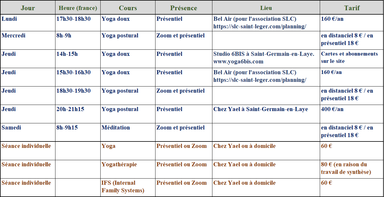 - Ateliers à Saint-Germain-en-Laye, en groupe (sur 5 semaines, ateliers de 2h30, sur les thèmes de la respiration, manger en pleine conscience, se tenir droit, soulager la douleur, introduction à la philosophie du yoga).